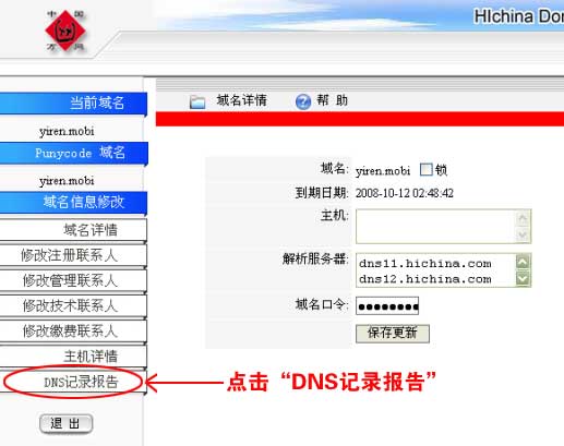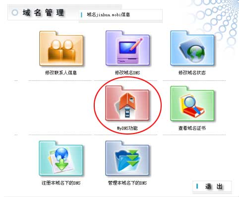 第二步 ---也就是修改的 DNS 生效后,我們再次登錄到域名管理主菜單,進(jìn)入第二項(xiàng)的 "MyDNS 功能 " 。 |