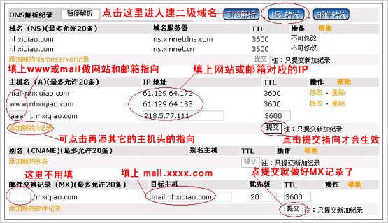 a、 郵箱指向:于主機(jī)記錄列表中增加一條,主機(jī)名填mail、類型選擇A、指向填上MAIL郵局IP |
