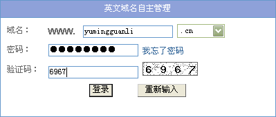 打開 http://mgt.dns.com.cn 網(wǎng)頁,輸入域名和域名管理密碼登錄,如下圖 |