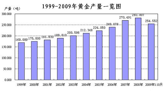 2009年10月,全國(guó)生產(chǎn)黃金26.354噸。1-10月累計(jì)完成254.552噸。與去年同期相比,黃金產(chǎn)量增加31.465噸,同比增長(zhǎng)14.10%。其中黃金礦產(chǎn)金累計(jì)完成211.598噸,比去年同期增長(zhǎng)14.70%。有色副產(chǎn)金完成42.955噸,比去年同期增長(zhǎng)11.25%。