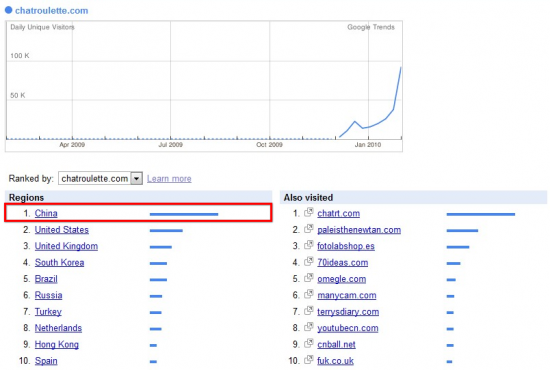據(jù)說(shuō)這個(gè)東西已經(jīng)一夜間成為全美高中生的新寵,大家沒(méi)事都在上面碰運(yùn)氣。我好奇之下就跑去 Google Trends 查趨勢(shì),結(jié)果 Chatroulette 居然還真的已經(jīng)比 Kindle 還紅了 。(所以“書中自有顏如玉”還是比不上網(wǎng)絡(luò)正妹!)