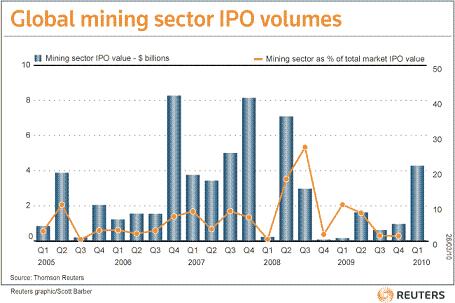 倫敦3月29日電,一些礦業(yè)公司正迫不及待準(zhǔn)備進(jìn)行股票掛牌上市,但在投資人挑精揀肥,只愿意對(duì)一線大廠捧場的情勢(shì)下,這些礦商或許不得不轉(zhuǎn)往其他市場集資. 分析師指出,許多礦業(yè)公司可能會(huì)決定向中國及其他亞洲企業(yè)出售股權(quán),或是同意簽訂長期供應(yīng)協(xié)議,以換取預(yù)付的現(xiàn)金款. 多家礦商的首次公開發(fā)行(IPO)案在景氣低迷期間遭到擱置,現(xiàn)在紛紛蓄勢(shì)待發(fā),但投資人對(duì)估值水準(zhǔn)及金屬的預(yù)測(cè)價(jià)格存有疑問. "自2008年年中以來,市場已經(jīng)大幅回升,但機(jī)構(gòu)投資者現(xiàn)在相當(dāng)挑剔,相當(dāng)謹(jǐn)慎,而且資金量可能不像幾年前那麼多了,"一位專精礦業(yè)領(lǐng)域的投資銀行人士稱. 在景氣衰退期間,礦業(yè)的IPO活動(dòng)大幅萎縮,根據(jù)湯森路透資料,2007年時(shí)共有173件,價(jià)值203億美元.去年僅有42件,價(jià)值34億美元,但2010年第一季已出現(xiàn)反彈.