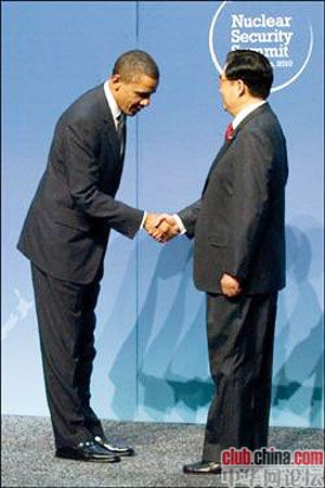 奧巴馬總統(tǒng)12日在核子峰會歡迎中國國家主席胡錦濤時,上身微微前傾地與胡握手,美國右翼媒體如獲至寶,大做文章,他們抨擊奧巴馬的「鞠躬」「丟了美國的臉」,使美國「蒙羞」,還重提奧巴馬過去向沙烏地阿拉伯國王、日本天皇和坦帕市長羅里奧「鞠躬」的老底。