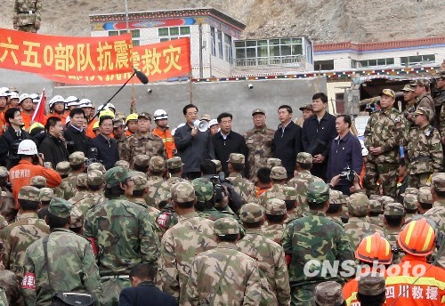 在受災(zāi)嚴(yán)重的扎西科村,胡錦濤走到正在清理廢墟的部隊(duì)官兵和公安民警中間,向大家表示誠(chéng)摯的慰問(wèn)。中新社發(fā)劉忠俊 攝