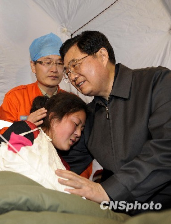 胡錦濤親切看望了醫(yī)療點(diǎn)帳篷內(nèi)的幾名受傷民眾。他表示,中央和政府保證災(zāi)區(qū)群眾有水喝,有飯吃,保證人民群眾的生命和財(cái)產(chǎn)安全,將來也一定會做好重建家園的工作。