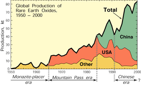 2000年前,各國(guó)稀土產(chǎn)量占全球比例的變化趨勢(shì)。
