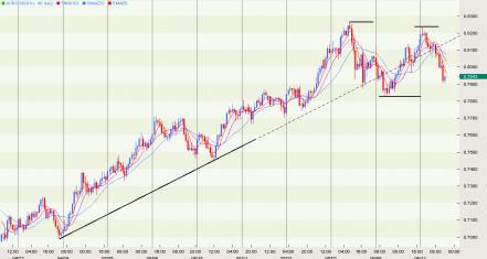 歐美股市以暴跌收盤,市場避險情緒陡增,美元全盤走強(qiáng),商品價格下跌打壓澳元。與英鎊兌美元走勢類似,澳元兌美元也存在形成潛在雙頂風(fēng)險。關(guān)鍵支持在0.7826,目前傾向逢高賣出,若能跌破0.7826將打開下跌空間。