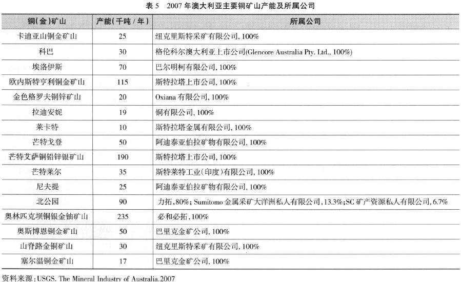 四、主要經(jīng)營(yíng)公司、主要生產(chǎn)礦山與冶煉廠 近些年,在澳大利亞開(kāi)展銅礦經(jīng)營(yíng)的公司主要有 斯特拉塔(Xstrata plc)、巴爾明柯(Barminco Ply Ltd.)、阿迪泰亞伯拉礦產(chǎn)有限公司(Aditya Birla Minerals Ltd.)、必和必拓(BHP Billiton Ltd.)、力拓(Rio Tinto Ltd.)、斯特萊特工業(yè)(印度)有限公司(Sterlite Industries( India) Ltd.)、巴里克金礦公司(Barrick Co1d Corp)、紐克里斯特采礦有限公司(Newcrest Mining Ltd)等,這些公司構(gòu)成了澳大利亞銅礦業(yè)的基礎(chǔ)和中堅(jiān)力量。 澳大利亞主要銅生產(chǎn)礦山有奧林匹克壩(Olympic Dam)、卡迪亞山(Cadia Hill)、科巴(Cobar)、埃洛伊斯(Eloise)、歐內(nèi)斯特亨利(Ernest Henry)、金色格羅夫(Golden Grove)、拉迪安妮(Lady Annie)、萊卡特(Leich-hardt)、芒特戈登(Mount Gordon)、芒特艾薩(Mount Isa)、芒特萊爾(Mount Lyell)、尼夫提(Nifty)、北公園(Northparkes)、奧斯博恩(Osborne)、山脊路(Ridgeway)、塞爾溫 (Selwyn)等。各主要礦山產(chǎn)能和所屬公司見(jiàn)表5。
