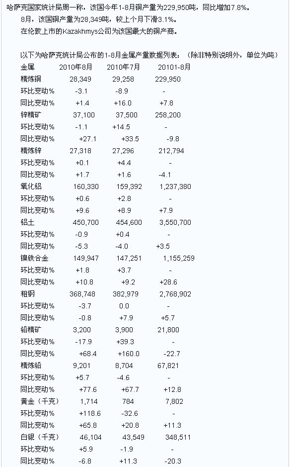 哈薩克1-8月產(chǎn)銅229,950噸,同比增加7.8%