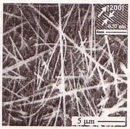 圖1 氣固相法合成的WO3納米線的SEM和HRTEM