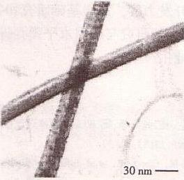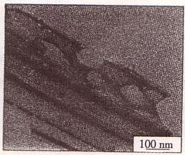 嵇天浩等人量取20 mLl mol/L的鹽酸,用去離子水稀釋至175 mL,在攪拌下再加入11g硫酸鉀,得到無色澄清透明溶液;然后加入5.7 g鎢酸鈉,獲得乳白色懸濁液;最后加入3.4 g草酸,懸濁液再 次變?yōu)闇\黃綠色透明溶液。將部分溶液移至50 mL 帶聚四氟乙烯的反應釜中,填充度約為85%;在160℃下反應24h得到深綠色產(chǎn)物。將產(chǎn)物用去離子水多次洗滌后和離心后再轉(zhuǎn)移至反應釜中,加入去離子矛水至填充度約為75 %,在180℃下反應48h,最終制備了寬度在100-300 nm間、長度可達數(shù)微米六方相WO3納米帶(見圖3)。