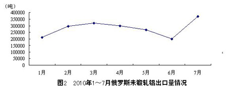 2010年1~7月,俄羅斯共出口未鍛軋鋁1965900噸,比2009年同期下降了4.0%。其中,7月俄羅斯出口未鍛軋鋁 370900噸,環(huán)比增長85.9%。整體來看,2010年以來,俄羅斯出口未鍛軋鋁以3月為分界線,1~3月為出口增長期,而3~6月為出口下降期,7 月則為觸底反彈,7月出口量較1月增長了74.1%。