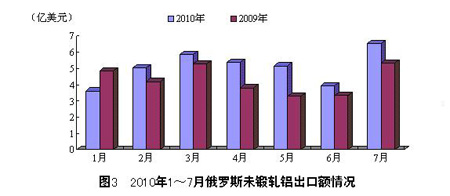 2010年1~7月,俄羅斯共出口未鍛軋鋁35.38億美元,比2009年同期增長18.1%。其中,7月,俄羅斯出口未鍛軋鋁6.5億美 元,環(huán)比增長65.8%,比2009年同期增長了22.4%。整體來看,2010年以來,俄羅斯未鍛軋鋁出口額在3月達(dá)到頂峰,此后一直向下滑落,7月觸 底反彈,此外,出口額除1月外均比2009年同期有較大幅度增長。