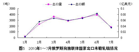 2010年1~7月,俄羅斯對獨聯(lián)體國家的未鍛軋鋁出口量為18100噸,出口額為0.37億美元。其中,7月對獨聯(lián)體國家的鋁出口量為1800噸,環(huán)比下降53.8%;出口額為0.034億美元,環(huán)比下降59.0%。
