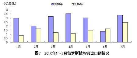 2010年1~7月,俄羅斯共出口精煉銅19.41億美元,比2009年同期10.3億美元的出口額增長了88.4%。其中,7月,俄羅斯出口精煉 銅3.35億美元,環(huán)比增長150.0%,同比增長35.6%。2010年以來,俄羅斯精煉銅出口額波動較大,基本呈漲跌互現(xiàn)的局面,最高峰出現(xiàn)在4月, 最低谷為6月,且與2009年同期相比,各月總體呈增長態(tài)勢。