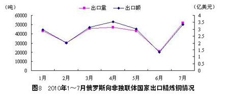 2010年1~7月,俄羅斯對獨聯(lián)體以外國家的精煉銅出口量總計為281800噸,比2009年同期的262200噸增長7.5%;出口額 為19.35億美元,比2009年同期的10.27億美元增長88.4%。其中,7月對獨聯(lián)體以外國家的精煉銅出口量為51600噸,環(huán)比增長 149.3%,同比增長2.6%;出口額為3.35億美元,環(huán)比增長153.8%,同比增長36.2%。整體來看,2010年以來,俄羅斯對獨聯(lián)體以外國家的精煉銅出口波動較大,其中2月和6出現(xiàn)過嚴(yán)重下滑,而4月和7月則為增長高峰期,體現(xiàn)出銅出口非常不穩(wěn)定。