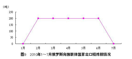 2010年1~7月,俄羅斯對獨聯(lián)體國家的精煉銅出口量為1000噸,出口額為0.061億美元。其中,7月對獨聯(lián)體國家的精煉銅出口量為 0噸。整體來看,2010年以來,除1月和7月為零出口外,俄羅斯向獨聯(lián)體國家的精煉銅出口一直保持穩(wěn)定的勢頭,波動不大,但數(shù)量也很有限。