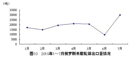 2010年1~7月,俄羅斯共出口未鍛軋鎳132000噸,同比下降1.3%。其中,7月,俄羅斯出口未鍛軋鎳29900噸,環(huán)比 增長214.7%。整體來看,2010年以來,俄羅斯未鍛軋鎳出口在經(jīng)歷了前5個月略有增長的情況下,在6月突然下探,此后又于7月迅速回升,7月的出口 量較1月增長了75.9%。