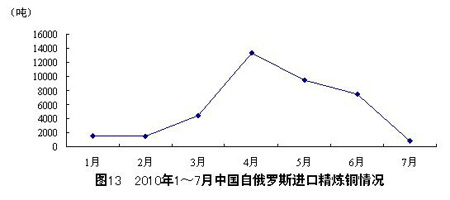 7月,中國自俄羅斯進(jìn)口精煉銅821噸,同比下降83.8%,占7月中國精煉銅進(jìn)口總量的0.4%。1~7月,中國自俄羅斯進(jìn)口精 煉銅38662噸,同比增長196.0%,占1~7月中國精煉銅進(jìn)口總量的2.2%。整體來看,2010年以來俄羅斯對華精煉銅出口在經(jīng)歷了前4個月的增 長后,5~7月呈現(xiàn)直線下滑趨勢,7月達(dá)到了谷底。