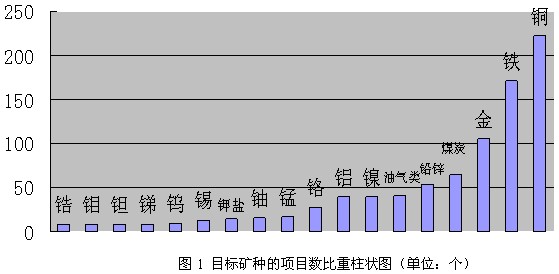 在933例項目中,從項目數(shù)量上來看,可分為四個等級。第一等級是企業(yè)境外投資項目,數(shù)量位列前三位的銅、鐵和黃金(其中勘查、開采項目以項目 的主礦種統(tǒng)計,伴生礦種未列入;并購案以目標(biāo)公司的主營礦種統(tǒng)計),項目數(shù)量分別都有上百例,遠遠高出其它礦種。其次是鉛鋅礦、鎳礦、鋁土礦、鉻鐵礦以及 石油、天然氣和煤炭等能源礦產(chǎn),投資項目數(shù)量分別在50例左右。第三等級是錳、鈾、鉀鹽、錫、鎢、銻、鉭、鉬、鋯礦,項目數(shù)量分別在十幾例左右。其它礦種 為鉑、鈀、鈷、鈦、寶石、螢石、大理石、石英、水晶、石膏、石墨等,項目數(shù)量都不多(圖1,圖2)。