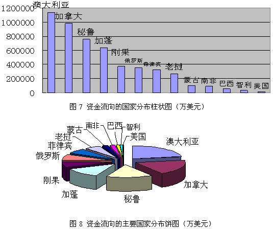 勘查、開采項目以項目的實際勘查開采地點進行統(tǒng)計;并購等間接投資以目標(biāo)礦業(yè)企業(yè)的所屬國進行統(tǒng)計。若該公司在兩個以上國家設(shè)有總部,則按該公 司的主營礦種總部所在地進行統(tǒng)計。如力拓在澳大利亞和英國都有總部,因其公司總資產(chǎn)89%集中在澳大利亞和北美且控股澳大利亞第二大鐵礦石生產(chǎn)公司,主營 礦種是鐵礦,因此將并購該項公司的150多億資金全部計入澳大利亞(注:意向投資均未列入統(tǒng)計)。