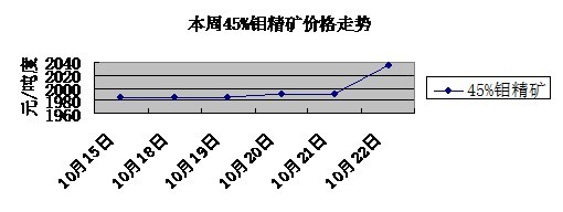 國內(nèi)市場 本周國內(nèi)鉬市延續(xù)上行走勢,鋼鐵廠也相繼入市采購,加上供應商主力都盡力穩(wěn)住價格,隨著需求上漲,鉬鐵價格一再被推高,至周末為止60%鉬鐵價格已經(jīng)漲到 了135,000-138,000元/噸,市場也出現(xiàn)了140,000元/噸的價格。由于鉬鐵生產(chǎn)商都加大生產(chǎn)以執(zhí)行前期的訂單,鉬精礦需求也一并帶起。然而,鉬精礦商惜售情緒頗濃,要價高,另外為達成節(jié)能減排目標,河南省政府從10月1日起開始對當?shù)馗吆哪芷髽I(yè)限電,該政策更堅定了鉬礦商咬住高價的信 心,當前鉬精礦價已經(jīng)漲到了2,020-2,050元/噸度,市場還出現(xiàn)了2,080元/噸度的高價,但是礦商惜售情緒導致鉬精礦市場成交不旺.