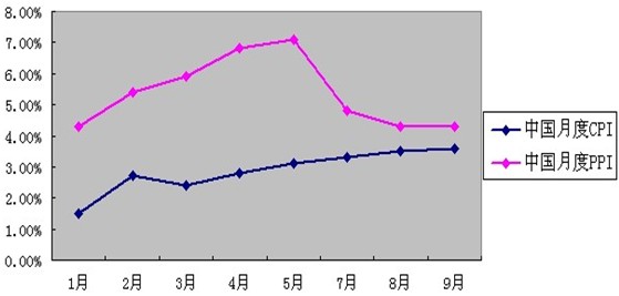 前 三季度,居民消費(fèi)價(jià)格(CPI)同比上漲2.9%。其中,城市上漲2.8%,農(nóng)村上漲3.1%。9月份CPI同比上漲3.6%,環(huán)比上漲0.6%。前三季 度,工業(yè)品出廠價(jià)格(PPI)同比上漲5.5%。9月份PPI同比上漲4.3%,環(huán)比上漲0.6%。推動(dòng)9月CPI繼續(xù)上行的主要因素仍是食品價(jià)格的快速 上漲,預(yù)計(jì)接下來10月,11月CPI將繼續(xù)高企,但考慮到大量農(nóng)產(chǎn)品會投放市場,農(nóng)產(chǎn)品價(jià)格漲勢將受抑制,同時(shí)央行已動(dòng)用加息政策抑制通脹預(yù)期,不排除 出臺連續(xù)緊縮政策的可能,綜合分析,12月份CPI大幅上行的勢頭有望得到有效緩解。另一方面,由于國際大宗商品價(jià)格持續(xù)上漲,原料價(jià)格的上漲最終必將推 高工業(yè)制成品的價(jià)格,預(yù)計(jì)四季度PPI將溫和上行。