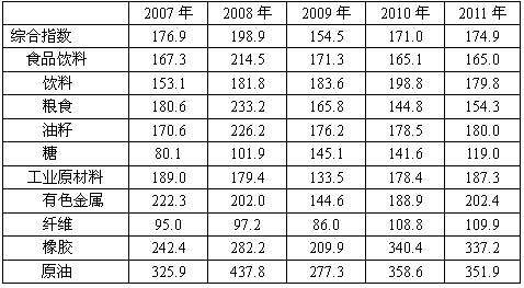 2010年以來,世界經(jīng)濟整體緩慢復蘇,國際商品市場在2009年下半年強勁反彈的基礎(chǔ)上繼續(xù)高位運行。國際貨幣基金組織(IMF)編制的商品 價格指數(shù)顯示,2010年9月底國際市場商品價格綜合指數(shù)同比上漲17.6%,比年初上漲3.7%,其中非能源類商品價格指數(shù)分別上漲23.5%和 12.8%,是價格上漲的主要推動因素;能源類商品同比上漲13.9%,但比年初下降1.2%。在非能源商品中,食品飲料價格指數(shù)分別比去年同期和今年初 上漲16.9%和10.6%,工業(yè)原材料分別上漲31.1%和15.2%。主要是由于新興經(jīng)濟體經(jīng)濟增長迅速、需求旺盛帶動國際商品市場需求回暖,自然災(zāi) 害影響農(nóng)業(yè)生產(chǎn)、流動性過剩和美元貶值導致資本投機炒作等也是影響國際商品價格變化的重要因素。