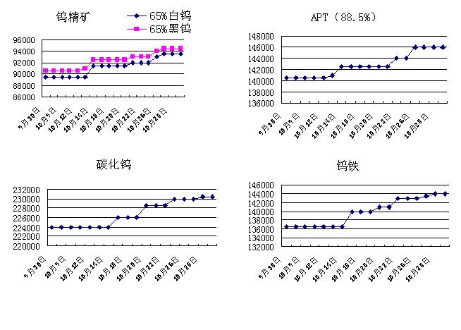 10月鎢系產(chǎn)品價格穩(wěn)定上行。 由于鎢精礦供應(yīng)缺口得不到緩解,下游產(chǎn)品價格承壓,鎢鐵、APT、碳化鎢等產(chǎn)品本月報價均有大幅上揚。 至月底,中國黑鎢精礦已經(jīng)漲到了94,000-95,000元/噸,而9月初的時候精礦價格為84,000-85,000元/噸,年初時價格才在68,000-69,000元/噸。白鎢精礦價格比黑鎢略低,但也有明顯上漲。鎢精礦價格已創(chuàng)下08年8月以來最高。 國產(chǎn)88.50%APT報價收于145,000-147,000元/噸,比年初上漲45%。歐洲APT市場同樣堅挺,價格頗有向300美元/噸度逼近的趨勢,且現(xiàn)貨十分有限,由于缺乏新增供應(yīng),消費商都試圖確保之前訂單的順利執(zhí)行。 國內(nèi)市場70%鎢鐵成交價已經(jīng)上漲到了143,000-145,000元/噸。且由于精礦供應(yīng)緊張使鎢鐵產(chǎn)量減少,不少生產(chǎn)商惜售情緒頗重,不愿報價。