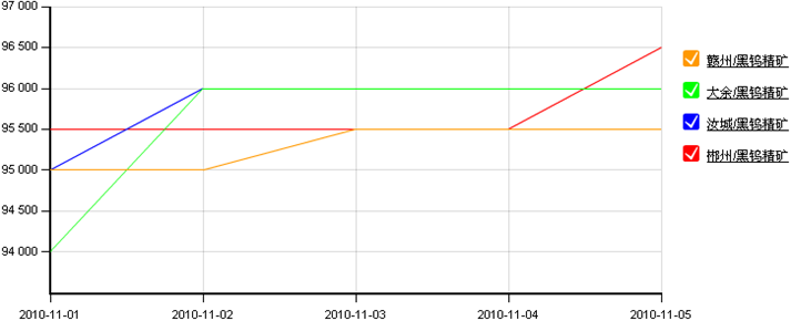 本周?chē)?guó)內(nèi)主要地區(qū)黑鎢精礦日均價(jià)格走勢(shì)圖如下圖所示: