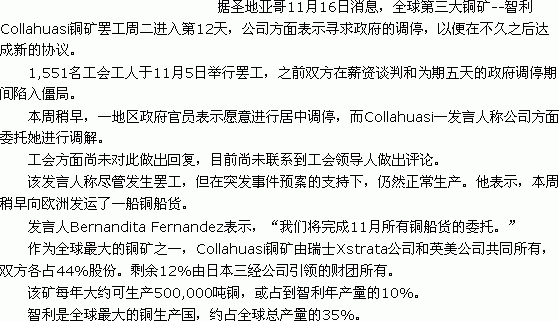 智利Collahuasi銅礦罷工進(jìn)入第12天,可能進(jìn)行調(diào)停