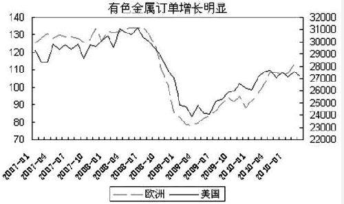 進入十月之后,國內銅消費逐步轉淡,這從各加工材行業(yè)不斷下降的開工率可以看出。根據(jù)上海有色網(wǎng)的統(tǒng)計數(shù)據(jù),11月份國內銅桿行業(yè)開工率較9月 份下滑7個百分點,而依然處于消費旺季的銅管行業(yè)開工率也出現(xiàn)了微幅下調,預示著國內消費轉弱的趨勢仍在繼續(xù)。與中國消費逐步弱化不同,美國和歐洲消費強 勁程度超過市場預期,這主要是受到美國和歐洲工業(yè)生產恢復的帶動,有色金屬訂單的增長很好地說明了這一點。自2009年4月份觸底反彈之后,歐洲和美國的有色金屬訂單保持增長的態(tài)勢,這種情況在近期并未發(fā)生改變。因此,美國和歐洲銅消費依然保持在高位,這與當前倫敦有色金屬交易所中歐洲和美國地區(qū)銅庫存的 持續(xù)流出相吻合。其中11月之后美國地區(qū)庫存下降的幅度接近5000噸。在庫存下降的同時,當前倫敦金屬交易所銅現(xiàn)貨升水已經上升至25美元/噸附近,表 明庫存的流出并不能滿足當?shù)叵M的需求。作為傳統(tǒng)的銅消費大國,美國和歐洲消費的增長在一定程度上對沖了中國消費下滑給市場帶來的沖擊。從而給銅價帶來一 定支撐。
