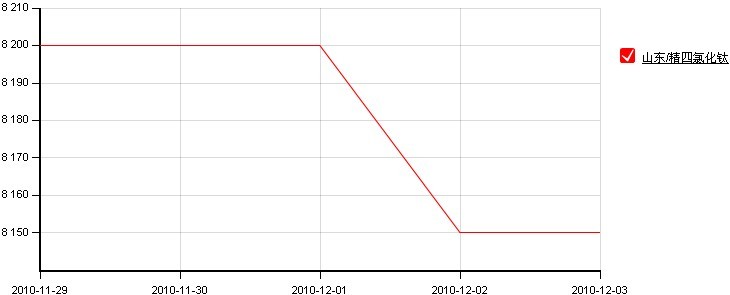 本周精四氯化鈦價(jià)格小幅下跌。以下是本周國(guó)內(nèi)山東地區(qū)四氯化鈦的行情走勢(shì)圖: