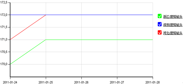 本周國內(nèi)主要地區(qū)廢鎢鉆頭日均價格走勢圖如下圖所示: