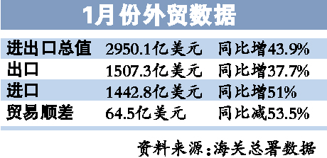 據(jù)新華社電 海關(guān)總署14日發(fā)布的數(shù)據(jù)顯示,1月份我國對外貿(mào)易進(jìn)出口總值為2950.1億美元,比去年同期增長43.9%。貿(mào)易順差達(dá)64.5億美元,減少 53.5%。海關(guān)數(shù)據(jù)顯示,1月我國外貿(mào)出口1507.3億美元,增長37.7%;進(jìn)口1442.8億美元,增長51%。