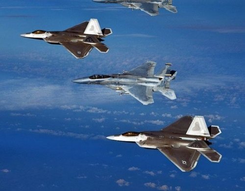 美國(guó)空軍F-22A戰(zhàn)機(jī)與F-15C戰(zhàn)機(jī)編隊(duì)巡航