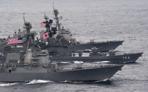 資料圖:1月10日,日美三艘參演戰(zhàn)艦組成海上編隊(duì)