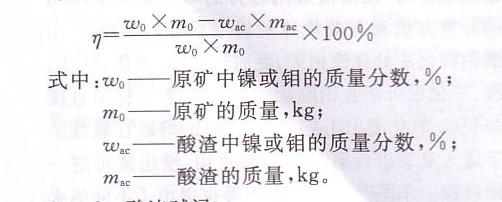鎳鉬的分析分別采用丁二酮肟比色法和硫氰酸鹽比色法。分析設備為721型分光光度計。酸浸中鎳或鉬的浸出率計算式為: