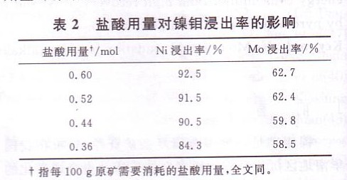 在固體氧化劑Ni用量為60 9《,液固比為3:1,溫度90℃左右,浸出時間2h的條件下,研究鹽酸用量對鎳鉬浸出率的影響,實驗結果如表2所示。