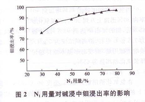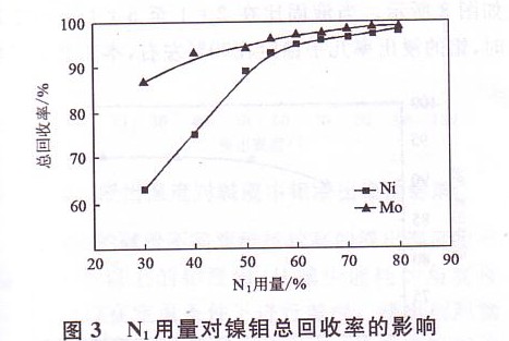 不同固體氧化劑Ni用量情況下得到的酸渣經堿浸處理后,鉬的浸出率隨著固體氧化劑Ni用量的增加也有一個逐漸上升至穩(wěn)定的過程,當固體氧化劑N,用量達到60%時,鉬的浸出率可維持在90 9《以上,全流程中鉬的總回收率在96%以上。本工藝選擇固體氧化劑Ni用量為礦量的60。