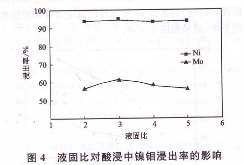 體系的液固比對酸性氧化浸出中鎳鉬浸出率的影響均不明顯,鎳的浸出率維持在93%左右,鉬的浸出率在液固比為3:1時有一峰值。考慮敝回比過小時浸出體系較粘,不利于攪拌均勻而引起局部溫度過高,導致礦漿噴濺,故選擇浸出過程中液固比為3:1。