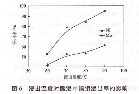 酸性氧化浸出中,體系的初始溫度由外部熱源提供,加入氧化劑后,反應會放出熱量,通過控制氧化劑溶液的加入速度來維持溫度與初始溫度一致,且反應過程中不需外部供熱。隨著溫度的升高,鎳鉬浸出率逐漸提高,在90℃左右浸出效果最好。在實驗中還發(fā)現,較高的初始溫度可以加快反應的進行。本工藝選擇浸出溫度為90℃左右。