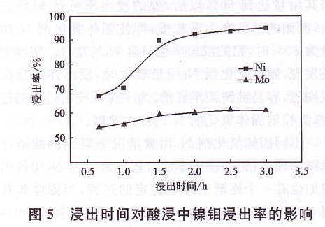 在鹽酸用量為O.52 mol,固體氧化劑Ni用量為60%,液固比為3:1,溫度90℃左右的條件下,研究浸出時間對鎳鉬浸出率的影響,結果如圖5所示。