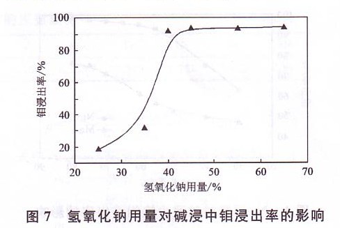 采用氫氧化鈉溶液浸出酸渣,液固比為3:1,溫度90℃左右,浸出時間th,研究了氫氧化鈉用量對鉬浸出率的影響,結果如圖7所示。氫氧化鈉用量也是以相對質量*來表示(全文同)。