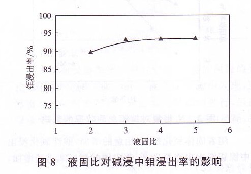 在氫氧化鈉用量為45%,溫度90℃,浸出時間th的條件下,研究液固比對鉬浸出率的影響,結果如圖8所示。當液固比在2:1至5:1之間變動時,鉬的浸出率幾乎穩(wěn)定在90 9《左右,本工藝為了使浸出體系攪拌均勻,選擇液固比為3:1。