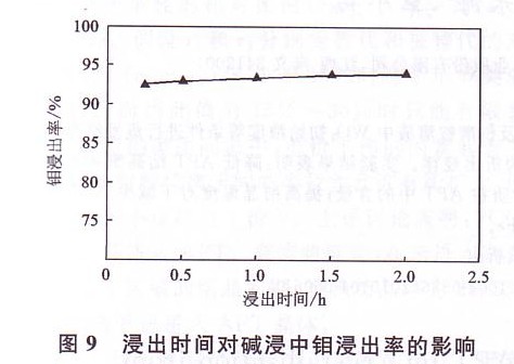 酸渣堿浸過程可以在很短的時間內完成,鉬浸出率始終維持在90%以上,延長浸出時間并不能提高鉬的浸出率。本工藝宜選擇浸出時間為15 min。