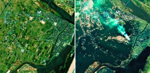 衛(wèi)星圖片顯示日本地震引發(fā)海嘯造成罕見災(zāi)難。左圖為2010年4月4日拍攝的日本natori地區(qū),右圖為2011年3月12日拍攝的地震海嘯襲擊過后的同一地區(qū)。