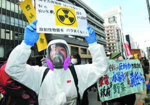 東京電力公司宣布,27日上午宣布的福島第一核電站2號(hào)機(jī)組渦輪機(jī)房地下室積水放射性物質(zhì)活度超標(biāo)1000萬(wàn)倍的數(shù)值嚴(yán)重有誤,重新分析后發(fā)現(xiàn),其放射性活度超標(biāo)10萬(wàn)倍左右,而非此前宣布的1000萬(wàn)倍。圖為示威者27日在東電總部大樓前抗議。