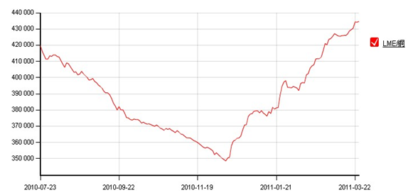 本周庫存仍處于增長通道中,較上周增加約5000 噸左右,另據(jù)有關(guān)機(jī)構(gòu)透露作為中國進(jìn)口銅主要港口的上海外高橋堆積著大量的銅,而其中一部分并不是用做原料加工而進(jìn)口的,相當(dāng)一部分是一些國內(nèi)企業(yè)為解決 資金短缺而進(jìn)口的銅,是一種投資品。從目前的庫存來看處于歷史的相對高位,倫銅近幾年的高位在55萬噸附近,現(xiàn)在LME銅庫存大約在43萬左右,我們預(yù)計 伴隨著中國下游銅消費(fèi)旺季的逐漸到來,及日本災(zāi)后重建,庫存有望逐步下降。
