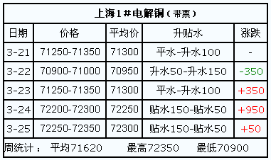 雖然上周銅價大漲,但是因上周初銅價過低拉低了均價,使得本周上海地區(qū)現(xiàn)貨銅均價較 上周有了 一個較為明顯的漲幅。本周銅均價環(huán)比增幅為2.74%,上漲1915元每噸。因本周銅價波動幅度對比上周來看稍顯平緩,致本周現(xiàn)貨銅升貼水區(qū)間較 上周也變化不大。期銅經(jīng)過上周五的大幅上漲之后,本周一小幅回調(diào),而現(xiàn)貨銅表現(xiàn)抗跌,市場成交一般。周二期銅低開高走,雖然銅價回落但仍提振市場人氣,下 游積極入市采購,成交轉(zhuǎn)好。周三期銅延續(xù)前日上漲勢頭,帶動現(xiàn)貨銅價上漲近四百元每噸,貿(mào)易商積極出貨,平水銅由升水轉(zhuǎn)為貼水出售,成交繼續(xù)好轉(zhuǎn)。倫銅夜 間大幅飆升帶動滬期銅周四跟漲,現(xiàn)貨隨期銅補(bǔ)漲近千元,現(xiàn)貨銅全線轉(zhuǎn)為貼水出售,貿(mào)易商因繼續(xù)看好后市稍顯惜售,但下游多駐足觀望,成交轉(zhuǎn)差。經(jīng)過昨日大 漲,周五期銅盤中跳水,現(xiàn)貨貼水再次轉(zhuǎn)為升水出售,表明市場貨源稍顯緊張,現(xiàn)貨表現(xiàn)抗跌功效,成交較周四好轉(zhuǎn)。